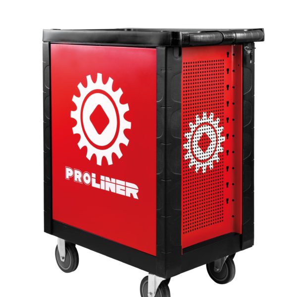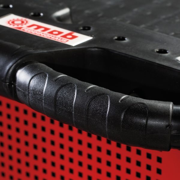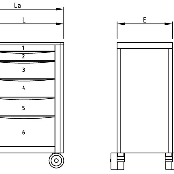 Servante 6 tiroirs. Construction résistante à 850 kg de charge statique. Tiroirs résistants à 25 kg. Verrouillage des tiroirs pour éviter toute ouverture intempestive lors des déplacements – déverrouillage par simple action de la poignée. Condamnation centralisée des tiroirs – 2 clés. 2 roues orientables dont 1 à frein et 2 roues fixes. PLATEAU : injecté en polypropylène, avec rebords anti-chute, poignée intégrée au plateau, prévu pour recevoir un étau de 100 mm avec base tournante. FINITION : peinture époxy, côtés perforés pour accueillir des accessoires, bumpers latéraux de protection, poignées de tiroir en métal et plastique, livrée avec un jeu de stickers (pictos, couleurs, initiales et chiffres), tapis de fond dans chaque tiroir. Chaque tiroir peut contenir 3 modules simples (ajouter le jeu de calage adapté).